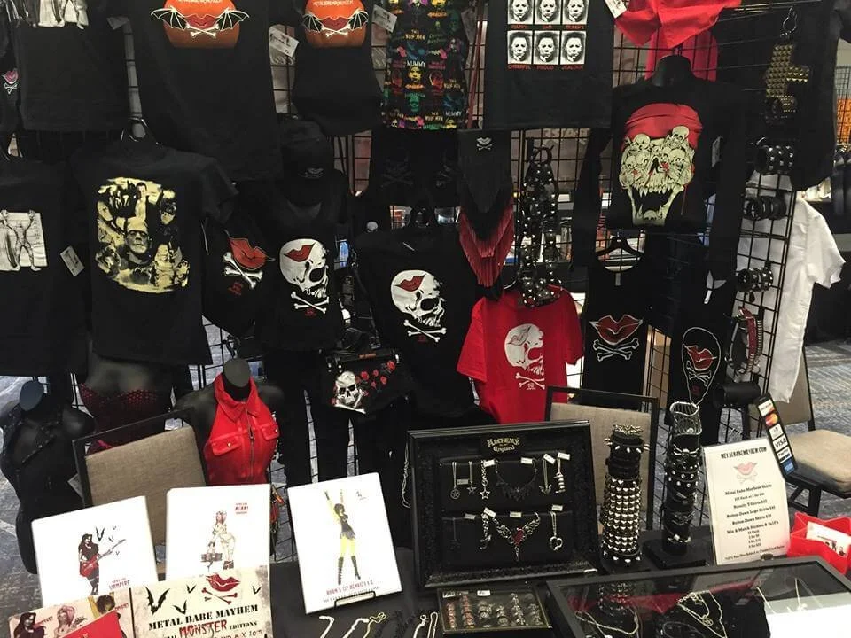 On the clothing side of things, Metal Babe Mayhem currently has over 20 designs, which are available on tank tops, T-shirts, hoodies, tote bags, flasks, and other items such as dresses, hats, hot short, belt buckles, stickers, and jewelry.