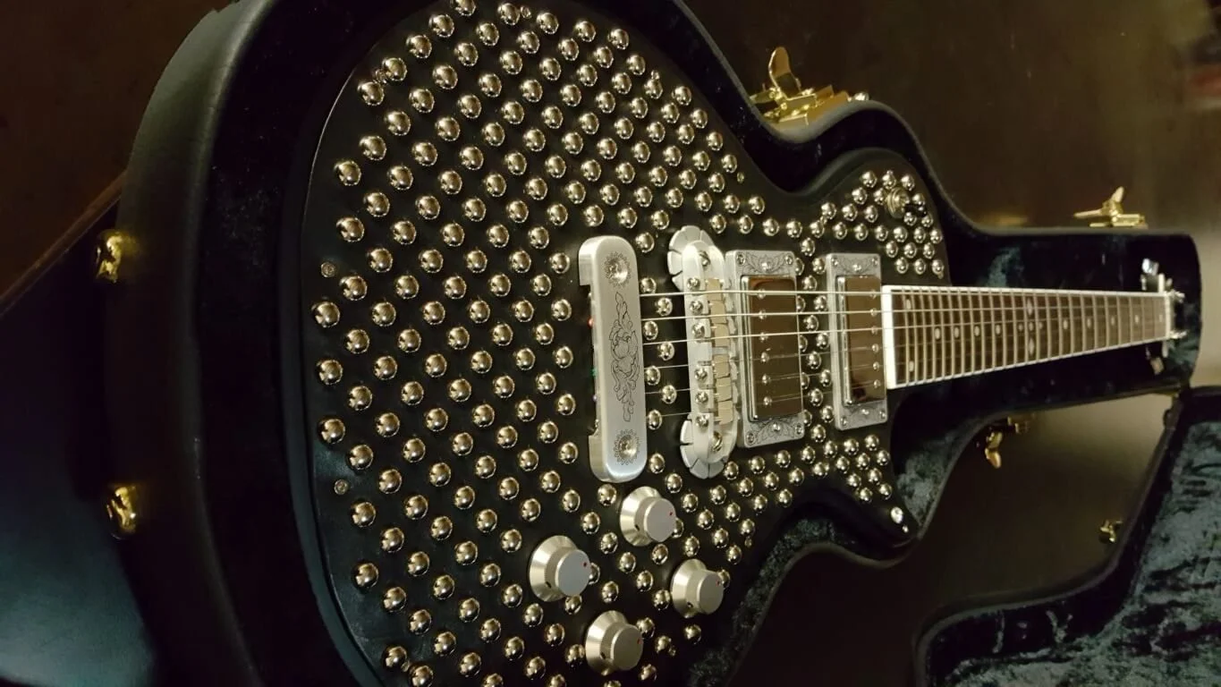 Al Bane was recently approached by Zemaitis Guitars to create custom leather guitar ‘covers’ and matching guitar straps for their NAMM booth 2017. (Booth #210C) So far, Bane has created five of ten designs to be showcased, including the Japanese Battle Flag, Pearl Spots, Black Star, Shrunken Goat, and a 3/8” Checkerboard pyramid. Ideas for the remaining five designs include an American Flag, ZZ Top Lightning Bolt, Texas America Flag, Skull & Crossbones, and Mother of Pearl Rhinestone design. In addition to the above-mentioned Zemaitis pieces and Metal Babe Mayhem “Studded Star,” Bane will also be displaying 28 guitar straps from his 2015 collection. The Pearl Spots guitar ‘cover’ was inspired by Tommy Henriksen (Hollywood Vampires) and has been played onstage at Soundcheck Live by Barry Pointer and seen on Michael Grant. (LA Guns).
