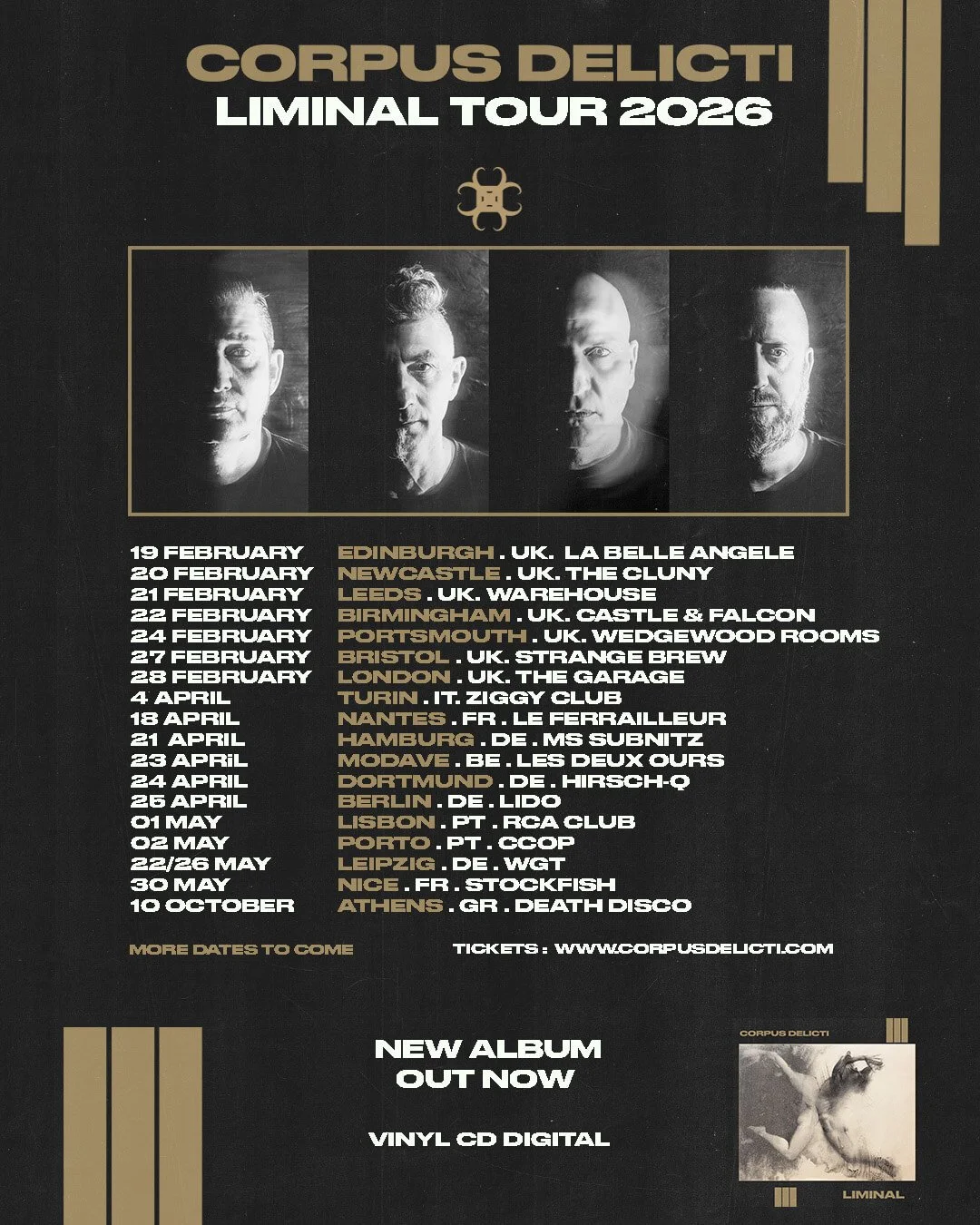 The long-anticipated reunion took shape in 2022, with sold-out shows from Cannes to Mexico City confirming that their music had not only endured, but grown in relevance. In February 2026, Corpus Delicti return to the UK with the Liminal tour, performing material from the new album alongside key songs from their catalogue.